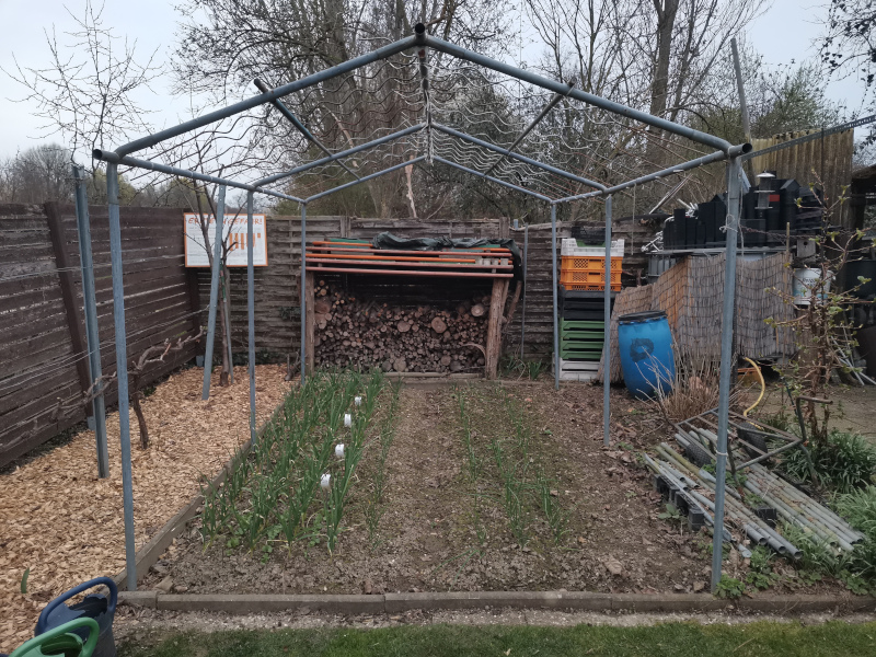 Das Zwiebelbeet mit Knobi links und Wintersteckzwiebeln wird die Tage mit den Sämlingen von der roten Zwiebel aus Tropea ergänzt.
