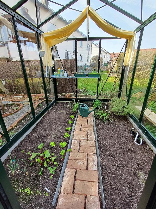 Gemüsegarten im weitesten Sinn: ein Blick ins Gewächshaus. Dauergäste sind eine Feige "Little Miss Figgy" und ein Rosmarin. Ansonsten im Moment Kleinkram wie Salat, Kohlrabi, Radieschen (ausgesät), Winterhecke, Knoblauch, Rote Bete... Ende April/Anfang Mai (je nach Witterung) sollen Tomaten einziehen, später dann auch Auberginen, Chilis, Gurken und Zuckermelonen.