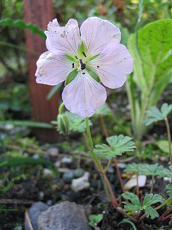 Vom vielen Regen und hungrigen Nachbarn leicht lädiert hat sich Geranium farreri geöffnet.