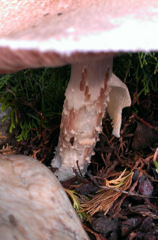 Ich hätte ebenfalls an einen Perlpilz gedacht, aber es stimmt... er läuft an den Fraßstellen deutlich rot an.