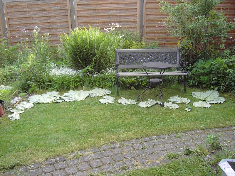 die Fang-Köder liegen schon aus. Dank Gänseliesels Tipp vor ein oder zwei Jahren weiß ich, wie sehr Schnecken welkende Rhabarberblätter lieben.