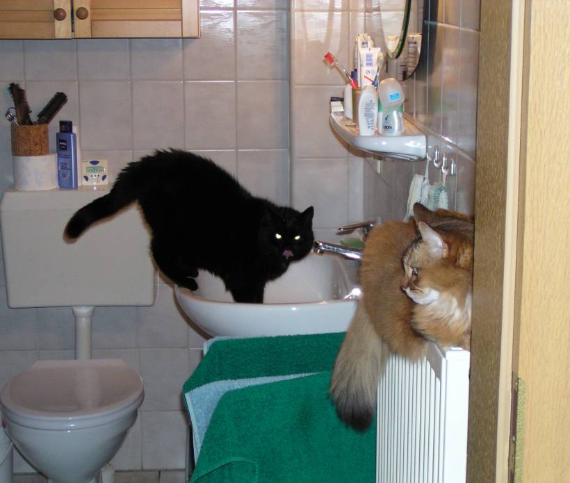 Hier meine beiden: die eine wärmt sich auf der Heizung, die andere trinkt Wasser mit Vorliebe aus dem Waschbecken
