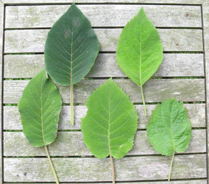 Ich hole diesen alten Thread einmal wieder hoch, weil ich jetzt offenbar die fünfte Variante von Hydrangea (aspera subsp.) sargentiana bekommen habe.Auf dem Foto von links oben nach rechts unten:Typ "Norddeutschland", den wir hier in der Baumschule hatten,Typ "Speckhard", mit eigentlich noch viel größerem Laub als ersterer,Typ "Fars", der erwiesenermaßen ein Sämling ist und der sich von den ersten beiden durch einen wesentlich lockeren Blütenstand unterscheidet.Typ "Hamburg", den ich letztes Jahr bekommen habe und der deutlich gröber gezähnte und gewellte Blätter hat als die ersten drei undTyp "Ostwestfalen", den ich gestern als bewurzeltes Steckholz bekommen habe.Es gibt viele ausgelesene und beschriebene Sorten von Hydrangea aspera bzw. H. villosa. H. sargentiana wird hingegen in der Literatur überall als Pflanze beschrieben, die sich durch ihre weißfilzige Behaarung auf den jungen (grünen) Trieben von den anderen Formen dieser Gruppe (ASPERAE) unterscheidet.Diese Unterscheidungsmerkmal zeigen alle fünf Pflanzen. Warum gibt es jedoch keine Pflanzen mit Sortennamen unter dem Namen Hydrangea aspera subsp. sargentiana, wenn die Variabilität dieser Unterart so groß zu sein scheint?Der letzte weicht nun scheinbar völlig von den anderen durch die Blattform und eine dünne "papierähnliche" Konsistenz und die fast schon "glänzende" Oberfläche des Laubs ab.Man kann einige der Unterschiede sicher auf die Standortbedingungen schieben. Aber diese Unterschiede?
