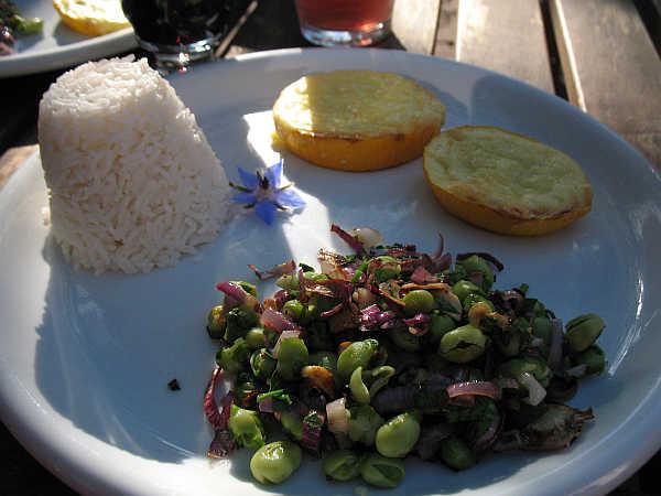 Es gab die ersten dicken Bohnen aus dem Garten, deutlich zuu früh geerntet. Ausbeute mager, aber sie zerschmolzen auf der Zunge, waren süß ...Dazu gab es Basmati und überbackene Zucchinischeiben. Davor einen bunten Salat.