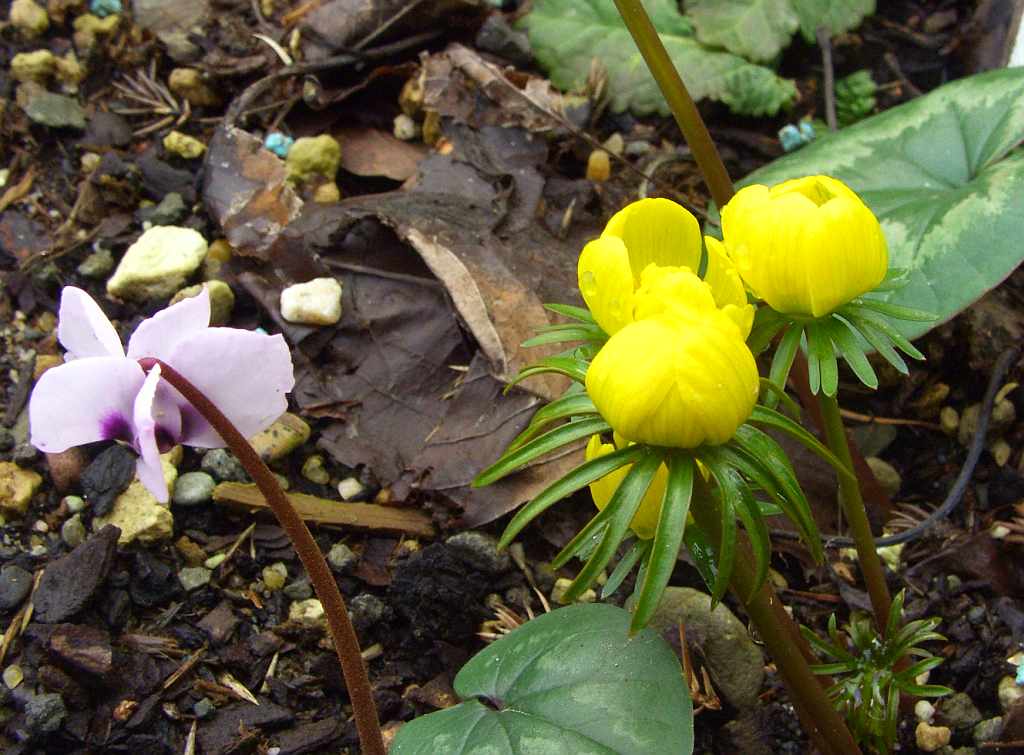 Eigentlich sollten hier im milden Westen die Pflanzen etwas eher dasein als anderswo - aber in diesem Jahr hängt hier manches zurück - zum Beispiel die Amur-Adonisröschen, aber auch diese Eranthis cilicica, die zwischen Cyclamen coum stehen.