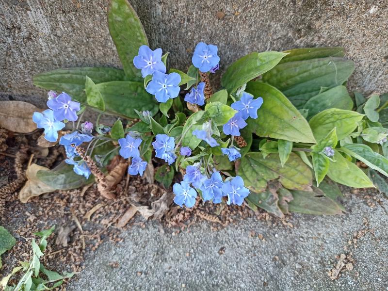 Hier hat sich ein Omphalodes verna, Frühlings-Nabelnüsschen aus meinem Vorgarten in eine schmale Ritze zwischen dem Vorgartenkantenstein und dem öffentlichen Gehweg ausgesät. :D
