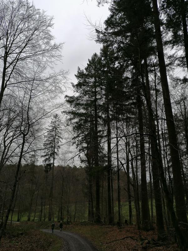 Einige hagere Lärchen stehen zwischen den Douglasien, das sah in der Herbstsonne nett aus.
