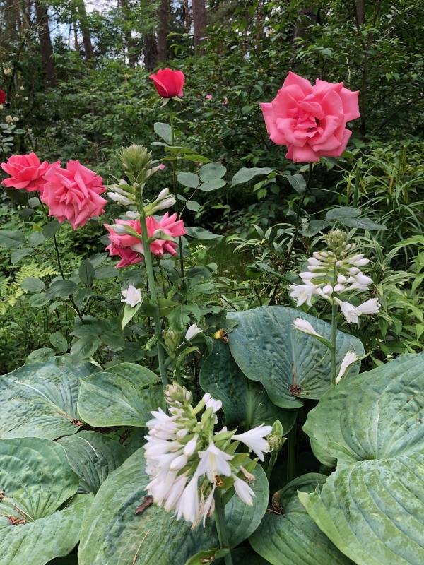 Hosta 'Spilt Milk' (die sich zu einem Monster entwickelt hat und dringend umziehen muss) mit einer unbekannten, mir aber sehr lieben, duftenden Aldi-Rose: