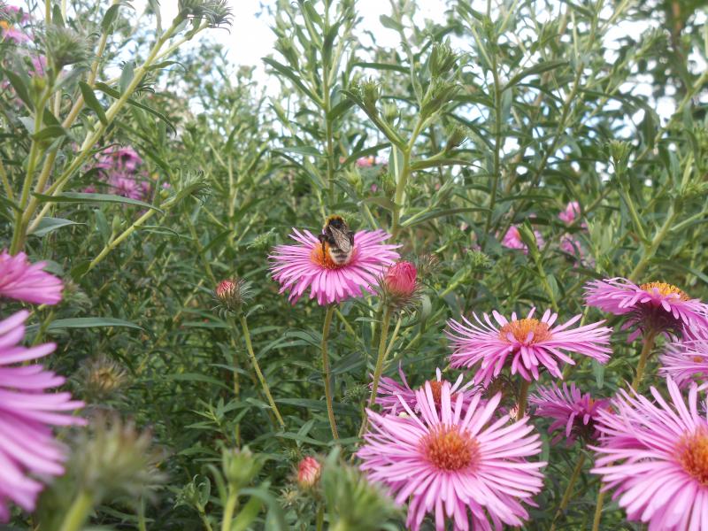 Ich hab an verschiedenen Stellen den Origanum vulgare. Der blüht bei mir immer sehr lange und wird gerne von Bienen und Schmetterlingen besucht.