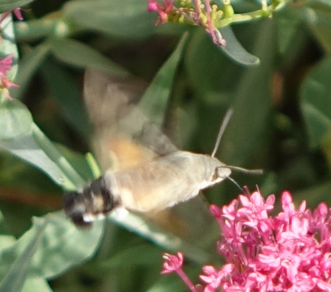 Ich hab jetzt auch mal ein Taubenschwänzchen vor die LInse bekommen und nach dem ersten Foto war prompt der Akku leer. Ein besseres Foto kann ich vielleicht später machen. Das Taubenschwänzchen ist eigentlich das einzige Insekt, das ausgiebig an der Spornblume Nektar sammelt. Andere schauen ab und zu mal an der Spornblume vorbei, um dann direkt weiterzufliegen. Das erste Taubenschwänzchen hab ich bei mir im Frühjahr an den Krokussen gesehen :D
