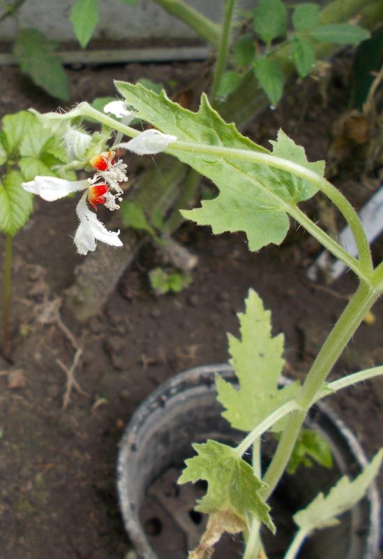 Von den zwei größeren Pflanzen in diesem Topf hat sich eine während meines Urlaubs zum Sterben entschlossen – die andere aber sieht vital aus, da kommt also sicher noch was. Die erste der Gewächshaus-Caiophora ist mittlerweile auch im Streckungswachstum angekommen  :D