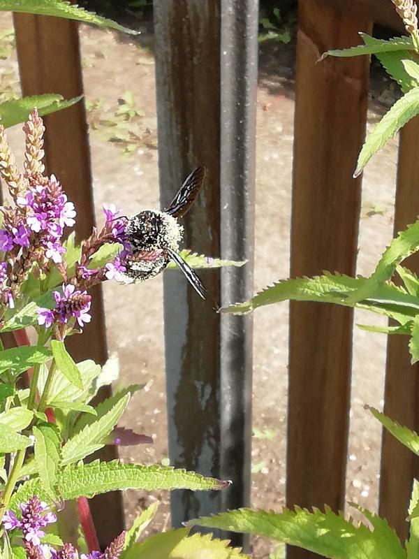 Die Schwarze Holzbiene getarnt beim Besuch der Blüten von Verbena hastata. Ob sie den Blütenstaub an diesen Blüten gesammelt hat?