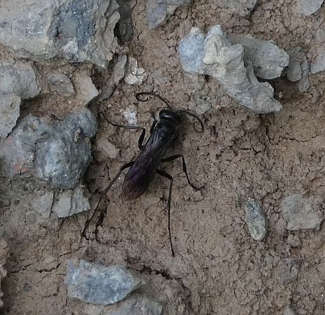 Gestern gelang es mir dafür eine der schwarzen flinken Wegwespen zu fotografieren. Ich tippe auf Tönnchen-Wegwespe, die sich gerade das Material für ihr Tönnchen holt.