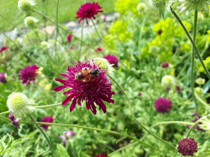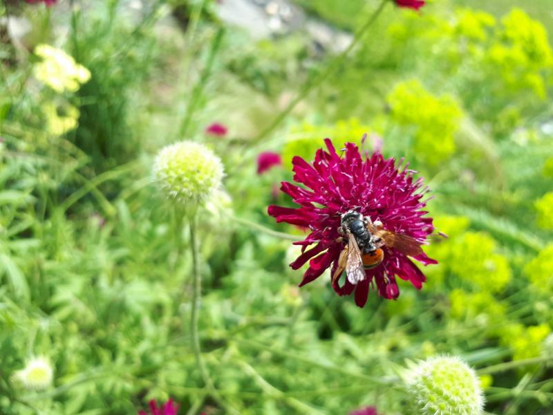 Könnt Ihr mit diesen Bienen etwas anfangen? Es waren mehrere. Sie hatten pinke Höschen an... oder war das etwa nur der Pollen von der Knautia?