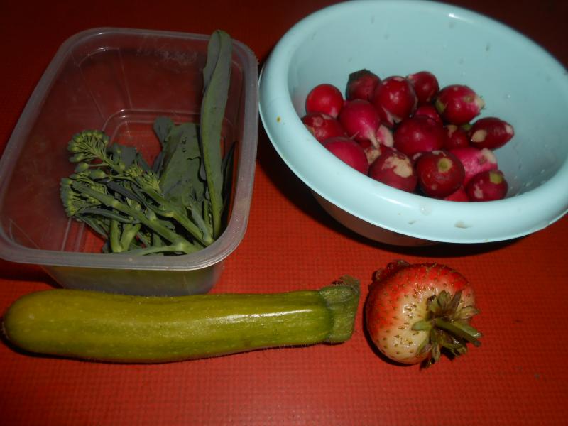 Gestern hat meine Tochter geerntet. Radieschen, ein bisschen Sprossenbroccoli, ein kleines Zucchinolein und eine Erdbeere Amandine, an der Spitze angefressen.