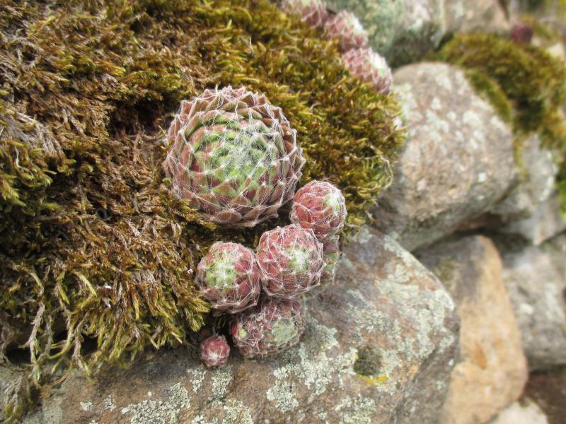 Dieses Sempervivum schmiegt sich besonders malerisch an die Steine.