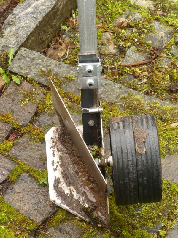 Abgestochene Rasenkanten sind ein eigenes Kapitel. Nicht alle mögen sie, manche brauchen sie, so wie ich. ;D Die Alternative mit einer fest installierten Rasenkante ist mir zu unflexibel und einige 100 m mit einem Handgerät abstechen, das wäre mir zu langweilig. Deshalb habe ich mir vor vielen Jahren dieses Gerät angeschafft. Das hat auch den unschätzbaren Wert, dass man beim Gebrauch immer die Richtung im Blick hat, wodurch der Kantenverlauf ruhiger und nicht zu kleinteilig wird. Weil die Kanten aber nur senkrecht abgeschnitten werden, muss das anfallende Material noch von der Kante weg bewegt werden. Dafür habe ich mir dann noch folgendes pflugähnliche Gerät gebastelt (werde ich demnächst noch etwas optimieren und gefälliger gestalten ;)) (Möglicherweise werde ich mir aber auch einen Fräsvorsatz für den Freischneider bauen, mit dem die abgeschnittene Erde gleich noch zerkleinert wird.)