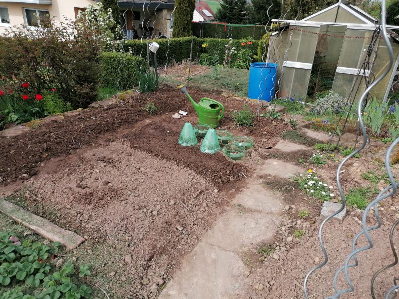 Ich hab im Herbst bestimmt 30 Eimer voll mit Pferdeäpfel gemischt mit feinem Holzhäcksel (Einstreu vom Stall) in den Boden untergehoben und Kalk draufgestreut.