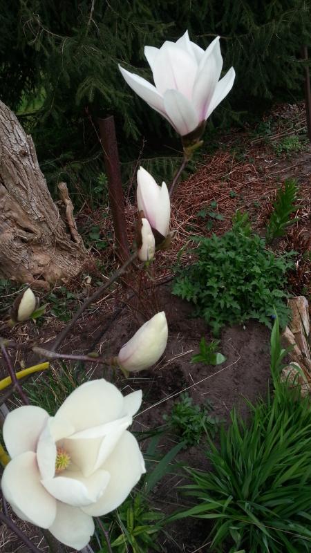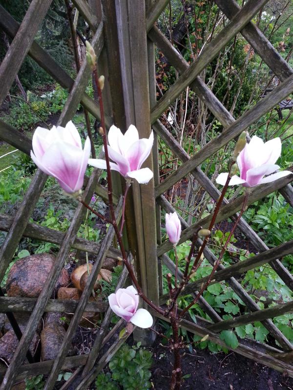 Auch hier beginnen die spätblühenden Magnolien jetzt mit der Blüte - Nimbus, Summer Solstiche und M. virginiana var. australis.Aber zuerst zum versprochenen Ganzkörperbild von M. laevifolia Michelle.