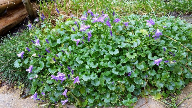 Unermüdlicher Dauerblüher, und dabei nur in eine Fuge gezwängt: Campanula poscharskyana.