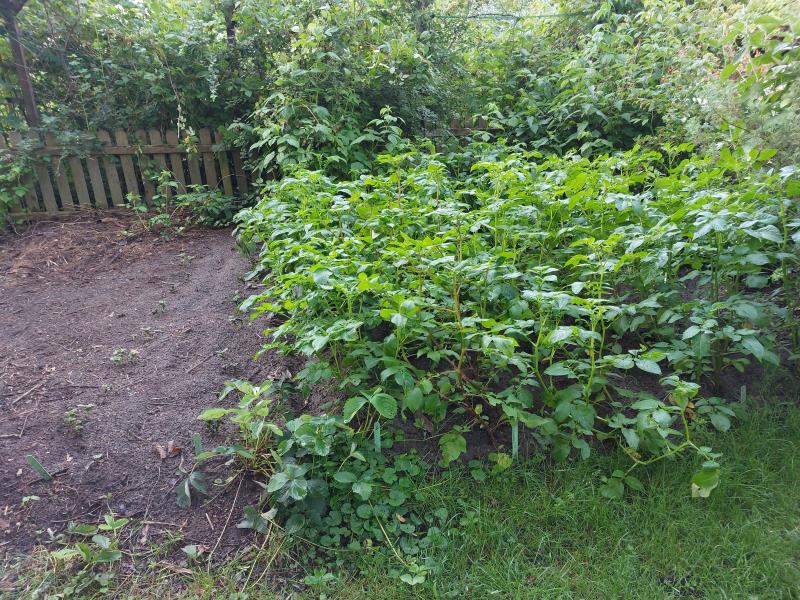 Hier die Kartoffeln - das ist das einzige Beet, dass im alten Gemüsegarten noch funktioniert und nicht so durchwurzelt ist, häufig dick gemulcht, lange Rotte, oft Kartoffeln und Grünkohl im Wechsel.
