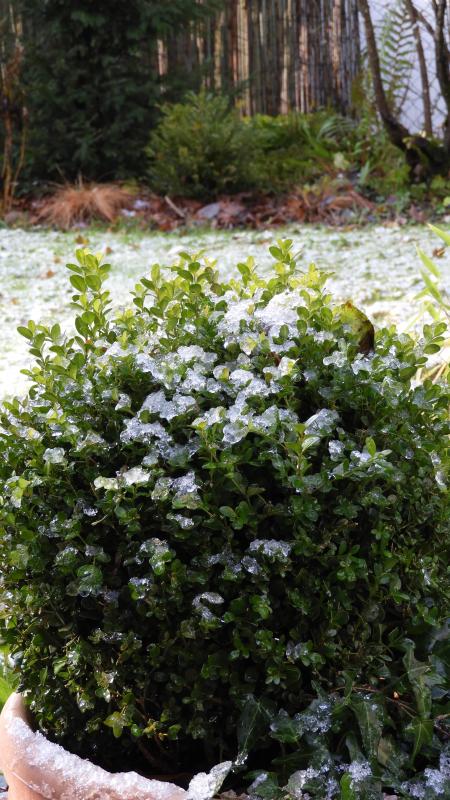 Wir haben eine neue Heizung. Es steht jetzt ein unschöner Kasten neben meinem Parkplatz. Und das Gebläse zielt u.a. auf den Buchs, Vereisungen haben es dadurch leichter. Mal schauen, wie das diesen Winter den Pflanzen bekommt. :-\ Aber heikles Zeug ist in der kleinen Ecke dort nicht drin.