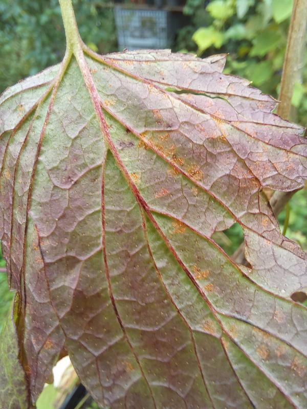 Vielleicht auch wegen des leichten Befalls von Johannisbeerensäulenrosts, der durch das nasse Wetter gefördert wird.