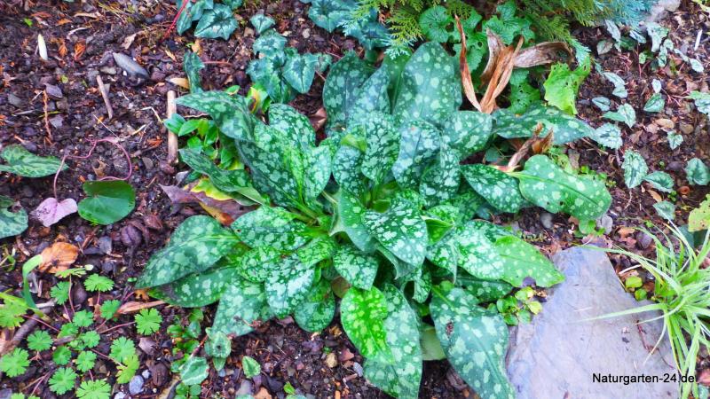Von dem zuverlässig wintergrünen Pulmonaria rubra hatte ich einmal große Bestände, die in den letzten heißen und trockenen Sommern zwar gelitten haben, sich in einer schattigeren Ecke mit humosem Boden und ohne Wurzeldruck gehalten haben.