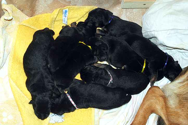 Es könnte daran liegen, daß sie eigentlich die Geburtsstellung schon beim kurzen nach draußen gehen eingenommen hat, sie dann aber wieder mit mir reingegangen ist und vermutlich die Wehen unterbrochen wurden dadurch. Es kann sein, daß der Welpe bereits im Geburtskanal steckte, dann aber irgendwie nicht weiter kam durch schwache Wehentätigkeit. Bei der Geburt habe ich auch - zum 1. Mal in meinem Leben - homöopathische Tropfen benutzt, weil die Wehen einfach nicht kamen - Zeit im Verzug.Wohl gemerkt - ich kann nicht sagen, daß ich an Homöopathie glaube oder etwas davon halte - ABER: in diesem Fall haben die Tropfen sofort angeschlagen und der Welpe war in Sekunden da. Inzwischen saugt er auch. Aber die Zeit wird es entscheiden - die ersten drei Tage muß er allein schaffen - .....Das später um 3 Uhr nachts geborene Mädel kam ganz normal - ohne irgendwelche Tropfen. Flutsch, da war es. Hat auch heute keinerlei Schwierigkeiten.Anbei ein Bild von allen mit Bändchen zum Wiegen:Woran könnte es liegen, dass das vorletzte Baby etwas schwächer ist?