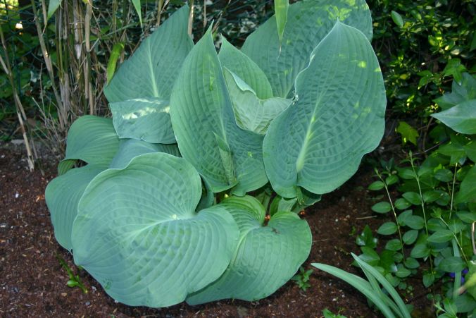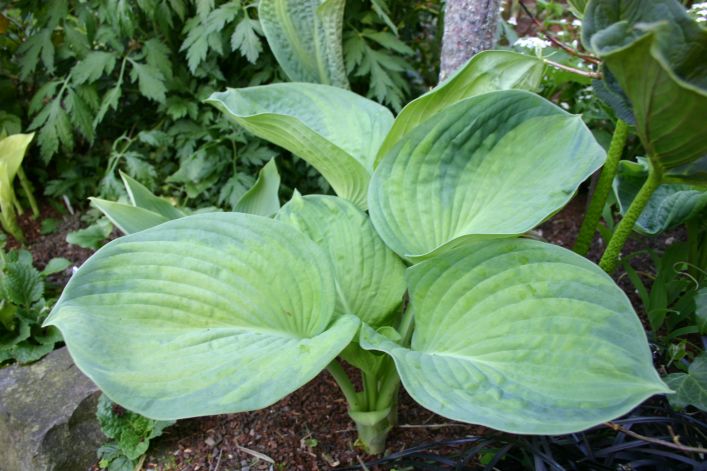 Schön für Ecken und hintere Plätze ist Hosta 'Snowden' mit ihren riesigen Blättern.