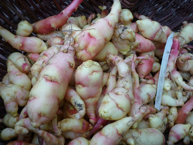 Da ich noch soo viele Pflanzen ausbuddeln muß, habe ich lieber heute schon mal angefangen, obwohl es mir eigentlich noch zu früh ist.....Ulluco rosa - mittelgroße Knollen aber reichlich