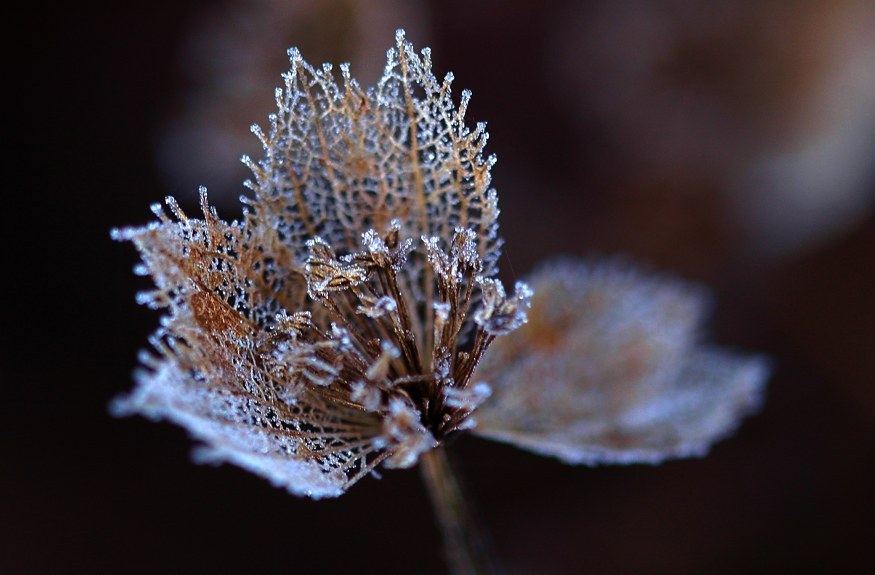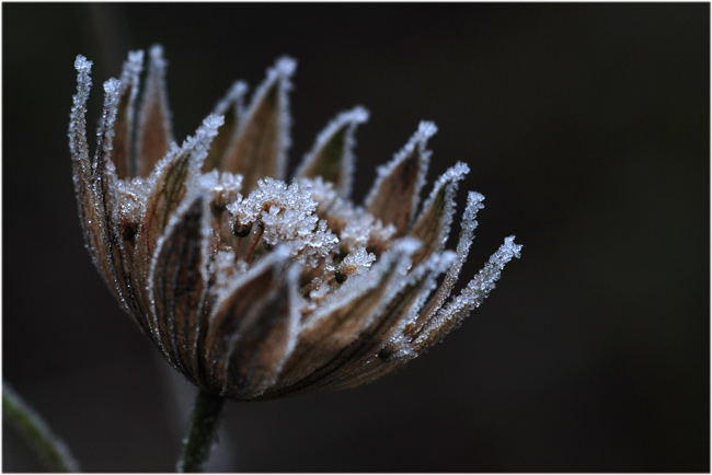 Hier war heute auch etwas Raureif, allerdings nicht so üppig, wie der gestrige eisige Nebel erwarten ließ.Ich habe es mal mit starker Unterbelichtung und Tonwertkorrektur mittels Photoshop versucht.Meine Lieblingsblüte nach dem Frost