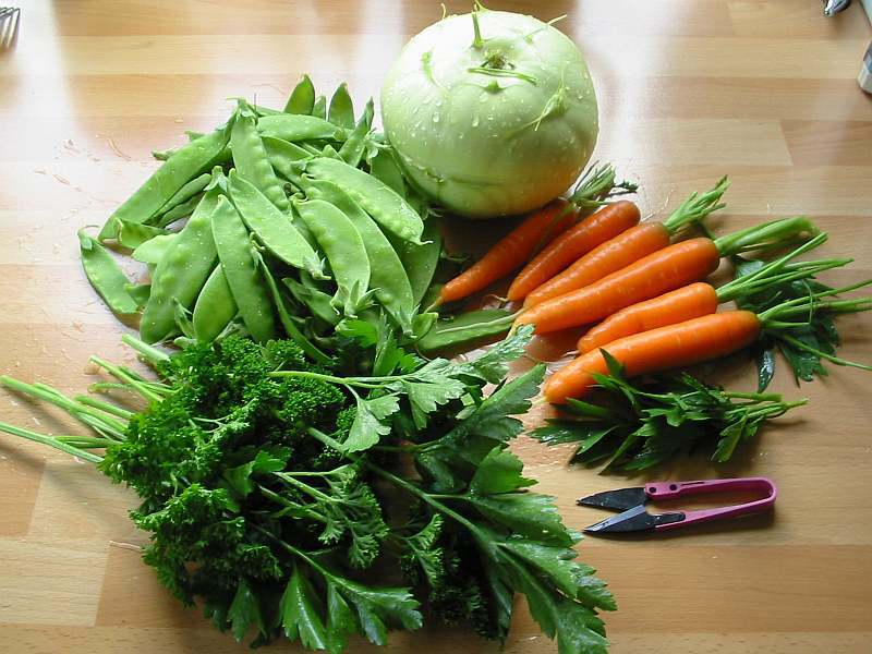 Gestern Broccoli und eine Wäschewanne voller Spinat.Und für Freunde einen großen Römersalat, einen dicken Kohlrabi und eine Tüte Zuckerschoten.
