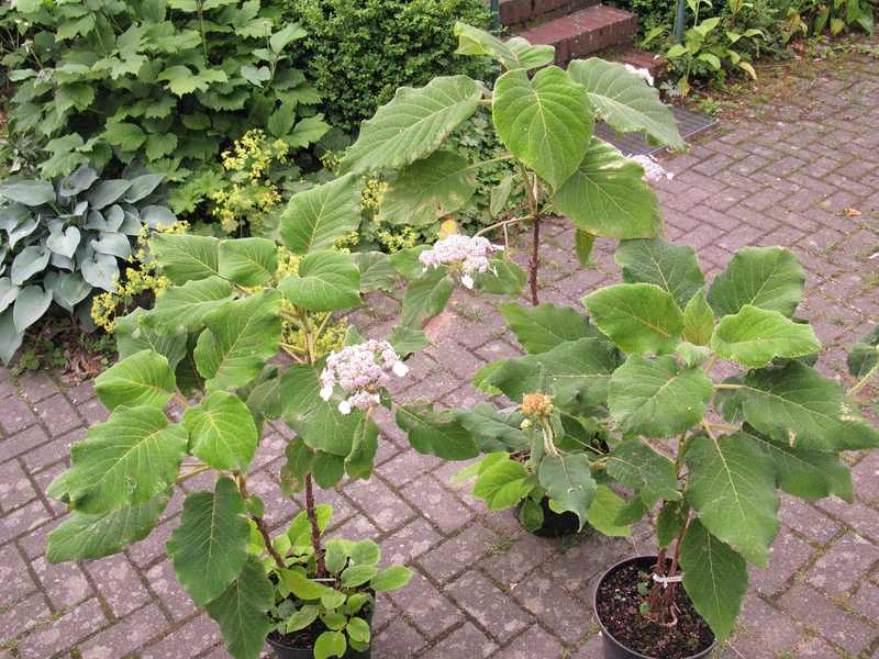 Wie schön, daß der 5. Typ "Ostwestfalen" den Weg zu Dir gefunden hat!!!Du hast die Besonderheit sicherlich sofort erkannt!Ich bin beeindruckt!Anderen Leuten wäre die Besonderheit dieser Pflanze womöglich nie aufgefallen - das wäre ja sehr schade gewesen.LGvon NemiIch hole diesen alten Thread einmal wieder hoch, weil ich jetzt offenbar die fünfte Variante von Hydrangea (aspera subsp.) sargentiana bekommen habe.Auf dem Foto von links oben nach rechts unten:Typ "Norddeutschland", den wir hier in der Baumschule hatten,Typ "Speckhard", mit eigentlich noch viel größerem Laub als ersterer,Typ "Fars", der erwiesenermaßen ein Sämling ist und der sich von den ersten beiden durch einen wesentlich lockeren Blütenstand unterscheidet.Typ "Hamburg", den ich letztes Jahr bekommen habe und der deutlich gröber gezähnte und gewellte Blätter hat als die ersten drei undTyp "Ostwestfalen", den ich gestern als bewurzeltes Steckholz bekommen habe..................................................Der letzte weicht nun scheinbar völlig von den anderen durch die Blattform und eine dünne "papierähnliche" Konsistenz und die fast schon "glänzende" Oberfläche des Laubs ab.Man kann einige der Unterschiede sicher auf die Standortbedingungen schieben. Aber diese Unterschiede?