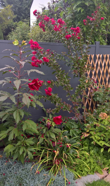 Ich grübele schon die ganze Zeit über den Namen meiner Lagerstroemia, muss mal forschen gehen. Jedenfalls steht sie neben dem Staudenhibiskus Midnight Marvel wirklich gut.