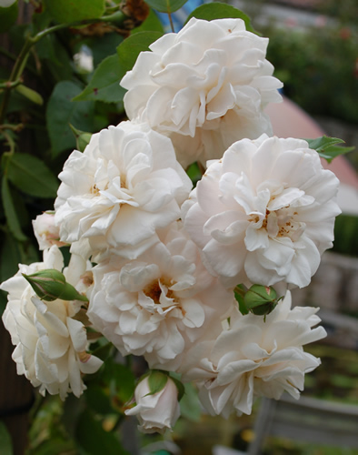 White Max Grafeigentlich eine einmalblühende Rose, zeigt aber munter wieder mehrere Blüten. Dazu macht sie ellenlage Triebe, heftig bewehrt, die sich durch und über alles schlängeln.