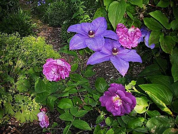 reine des violettes, rhapsodie in blue und clematis xerxes