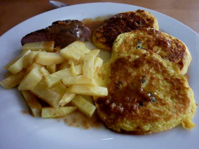 Samstag gab es Polenta mit Salat. Die Polenta war mit Speckwürfeln, roten Paprika, Olivenöl und Parmesan getunt. Gestern Reibekuchen mit Wirsinggemüse.