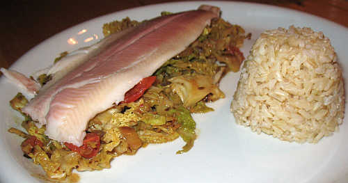 Her gab es Endiviensalat und anschließend geräuchertes Forellenfilet auf Wirsing in Kokosmilch, dazu Reis.