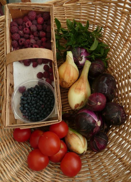 Die ersten Zucchinis und die erste Gurke und Johannisbeeren, die es alle nicht bis zum Gartentisch geschafft haben...