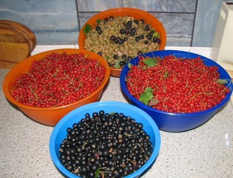 Rote und schwarze Johannisbeeren, Stachelbeeren für MarmeladePflücksalat und Hurra- die erste Tomate