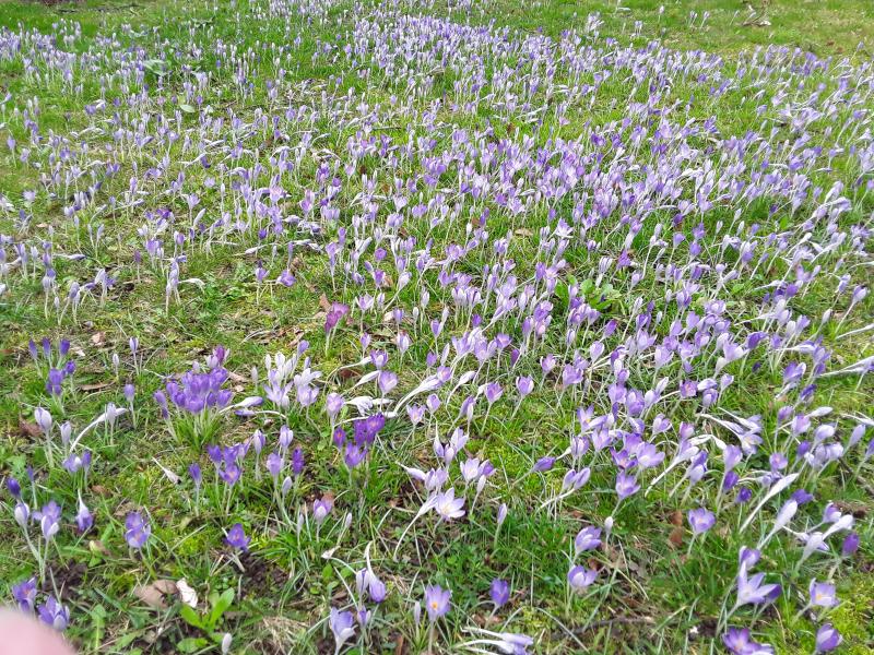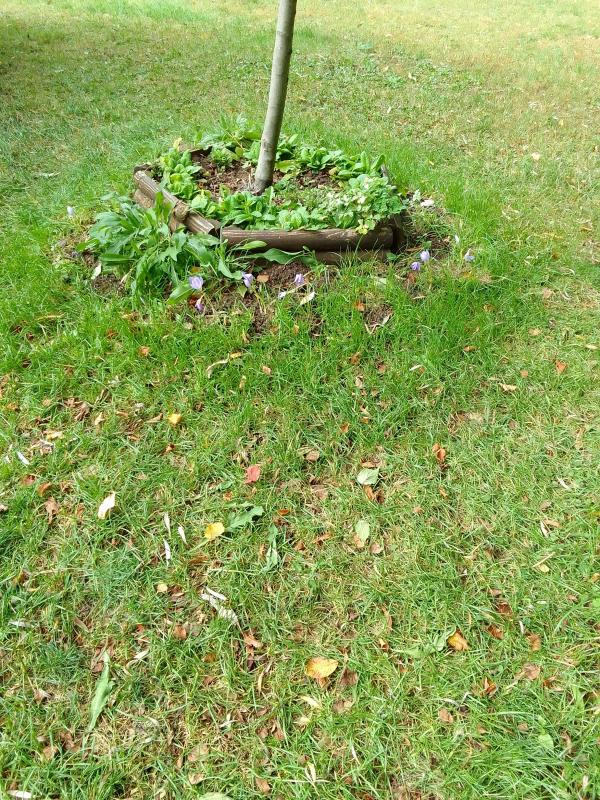 Baumscheibe mit Primeln und rundherum noch Krokusse eingebudeld.