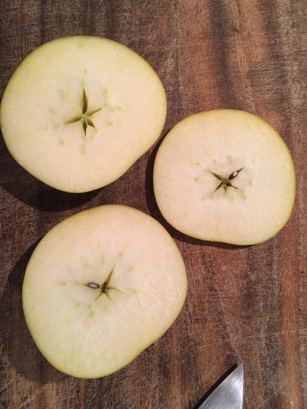 Wenn du wirklich durch die Kelchröhre geschnitten hast und die so aussieht, dann ist das kein gelber Edelapfel. Dann ist der Seestermüher der nächste Ratekandidat.