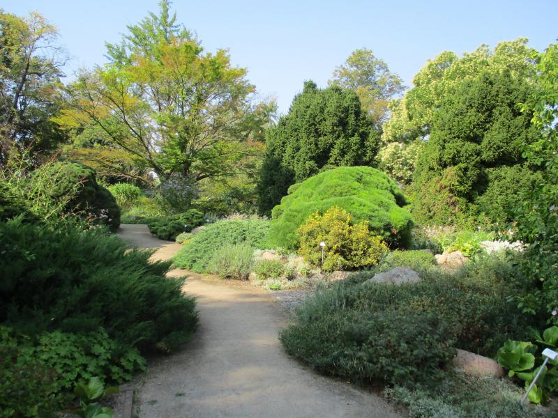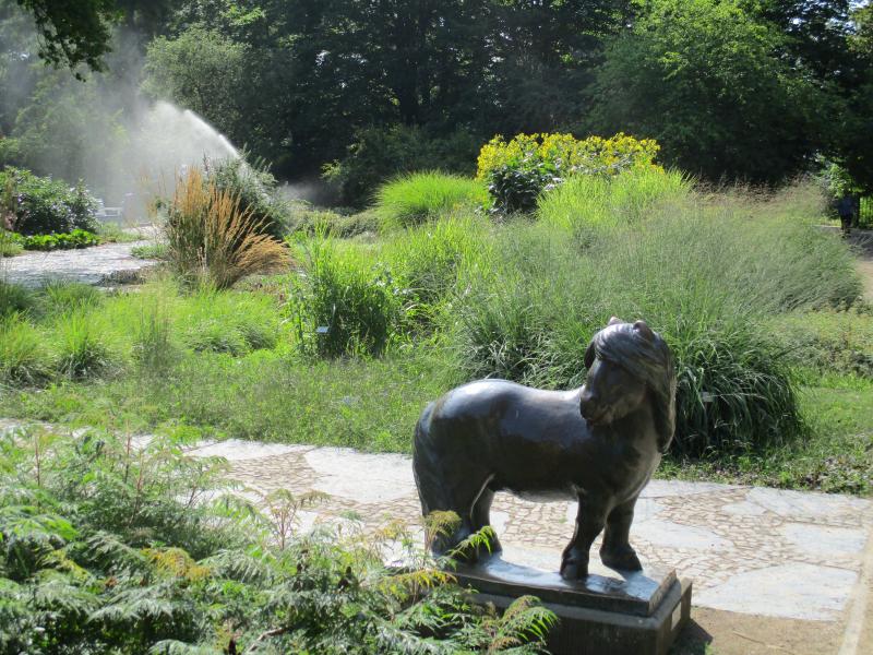 Die Beetbereiche werden mit vielen Regnern bewässert. Es war ein bisschen knifflig: beobachten, abwarten bis der Schlagregner vorbei ist, schnell langhuschen, abstoppen da man in den Bereich des nächsten Regners kam, hinter Säulen Schutz suchen, wieder durchhuschen, beobachten, dieser Regner ändert die Richtung, Sekunden zählen, welcher Weg passt ...