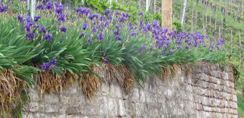 Zuerst eine Reihe Iris germanica, nicht meine, sondern einmal ums Eck, in den hiesigen Weinbergen. Gepflanzt von einem leider verstorbenen Wengerter, der es einfach gerne gesehen hat, "Wenn da au ebbes blüht". Seine Nachfahren halten sein Andenken hoch, die Reben dahinter wurden gerodet und neu gepflanzt, auf die Iris hat man offensichtlich aufgepasst!