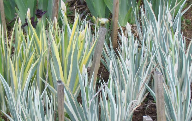 Die buntlaubigen Iris pallida sind zur Zeit besonders schön, die Weißen wachsen etwas stärker als die Gelben, dafür haben diese weniger braune Spitzen.