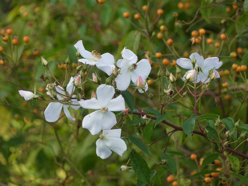 Bei mir steht sie leider sehr bedrängt, doch immer wieder sind die auffallenden Blüten zu sehen. Zusätzlich bekommt sie im Herbst große orangefarbene Hagebutten.