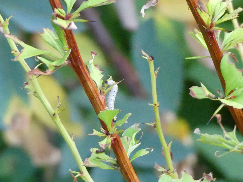Ob das wohl die Raupe vom Blaukopf ist? Drei Berberitzen im Birkenhain-Beet sind kahlgefressen. :P