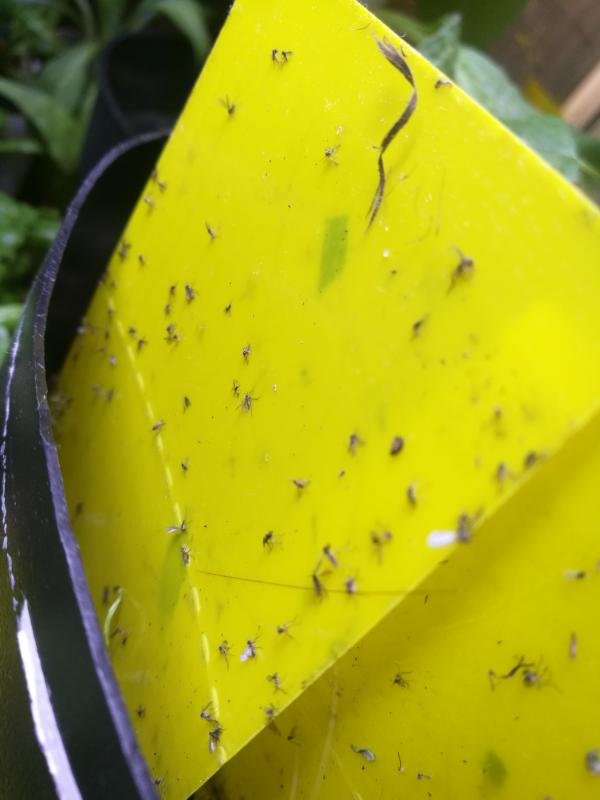 Ausserdem habe ich wohl Trauermücken und Thripsen im Übermaß. Letzteres erkennt man am Schadbild und den kleinen gelben Larven die manchmal auf den Blättern rumkriechen. Hier ein Foto von e Gelbtafel.