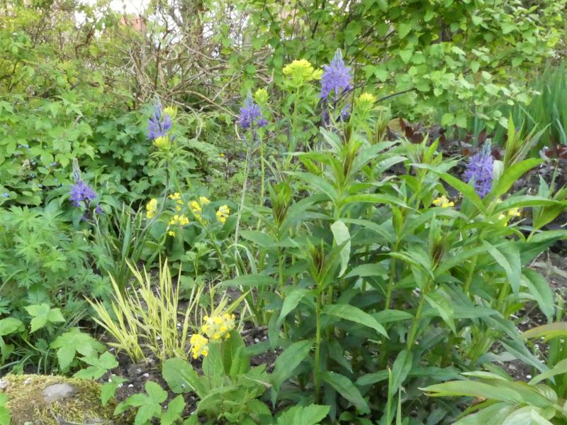 die Camassiengruppe im Vorgarten wird jährlich größer. Hier zusammen mit Tulpen und Primula veris im Hintergrund.